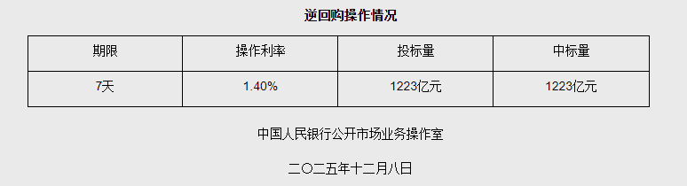 12月8日央行开展1223亿元7天期逆回购操作